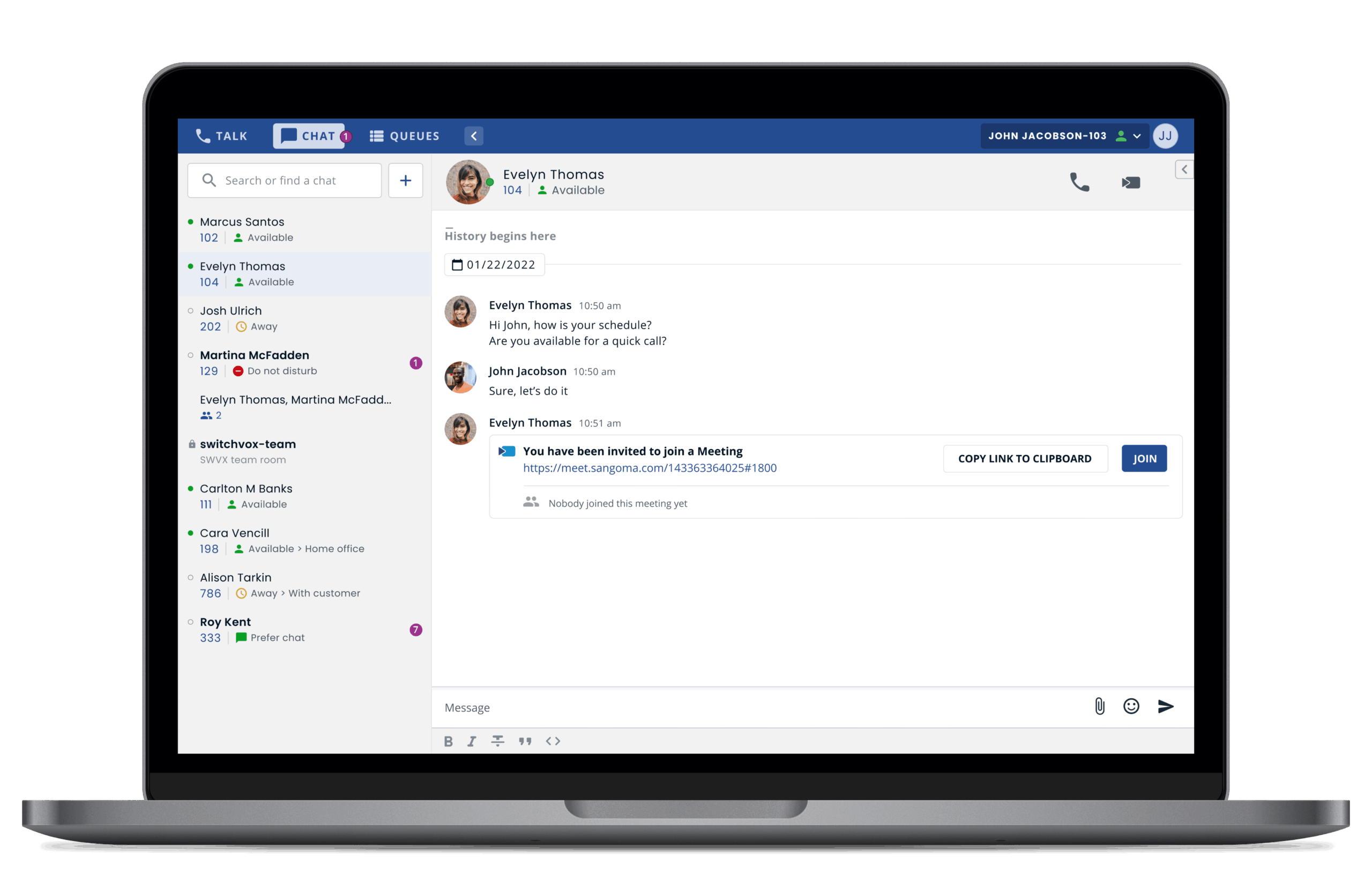 El proceso de incorporación intuitivo envía un correo electrónico generado automáticamente a cada usuario en el momento de activarse el PBX con instrucciones sencillas para que descarguen la aplicación con inicio de sesión instantáneo. Así de sencillo.